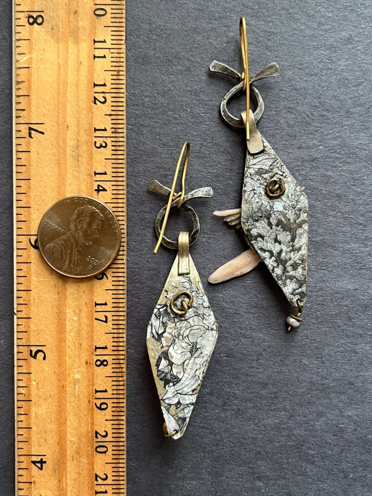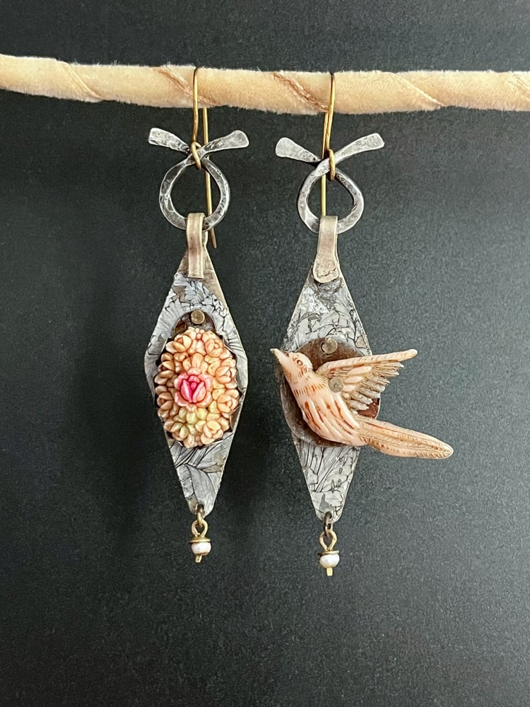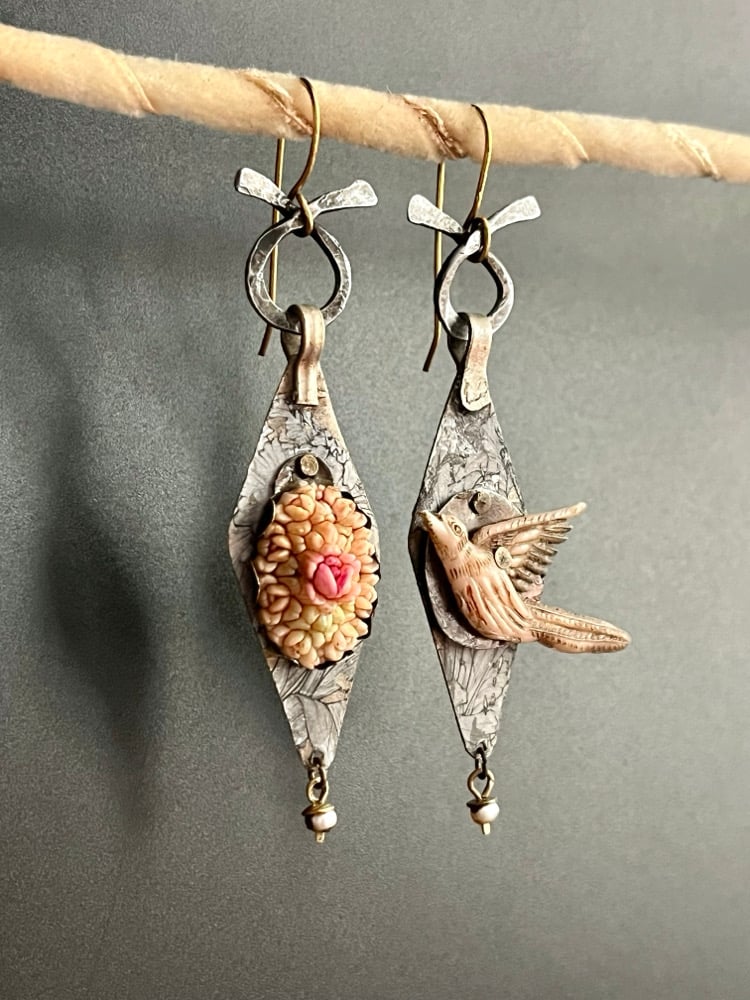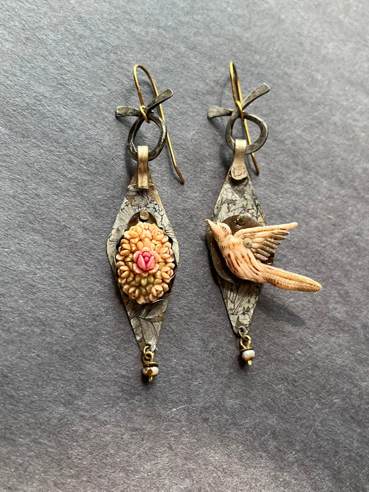 Long antique Kuchi charms reworked into feminine and grungy charmers. They are embellished with a floral transfer and then mounted by two different vintage focals. A bird and a floral cluster layered over salvaged tin. Above is a hammered steel loop, below is a tiny pearl dangle. More florals on the reverse