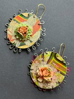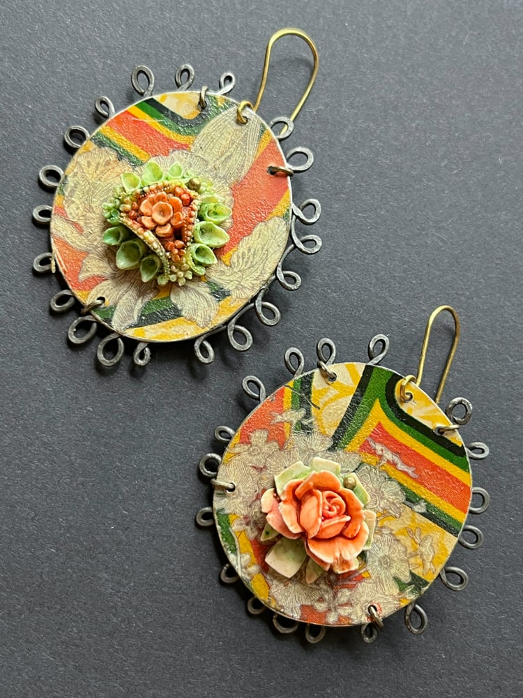 These focals are vintage and new floral cabs which I’ve painted to complement the tin. From behind we see another surprise element- a frame of hammered steel loops.