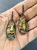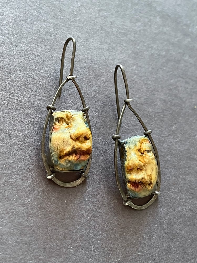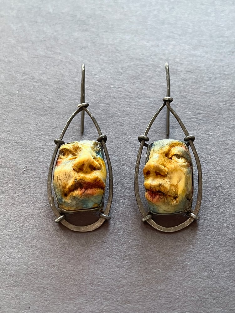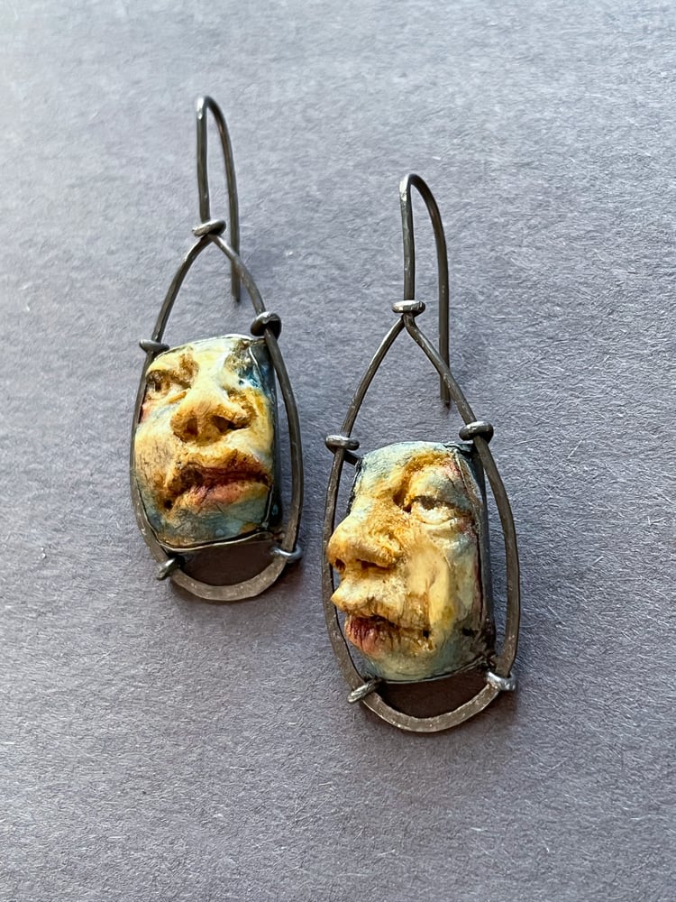 Wonderfully detailed sculpted faces peek out from tiny boxes. They have a crackled texture with washes of blue and ivory yellow. They hang within a hammered steel ring.